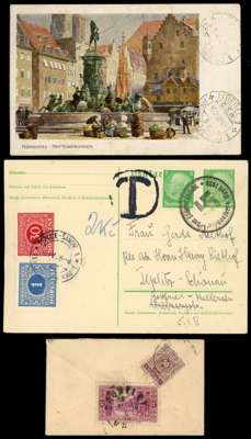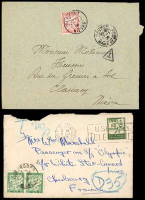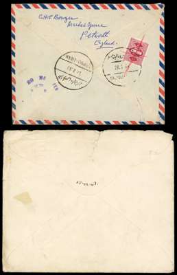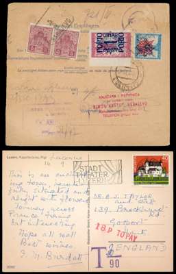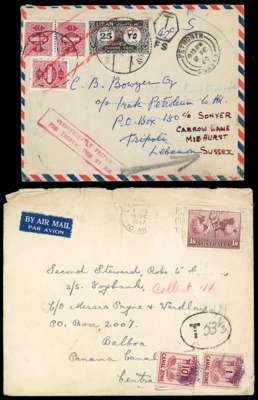 Postage Dues. Postal History accumulation with Morocco 1930s calling card envelope underfranked to Fez, Morocco with 50c Postage Due 1960 incoming stampless cover from Petworth, Sussex to Lebanon with four 5p and a 25p tied Tripoli Liban date stamps, Australia 1947 airmail cover (some damage at top) to Balboa, Canal Zone with Canal Zone 1c and 10c applied; some mixed condition (10 items)
