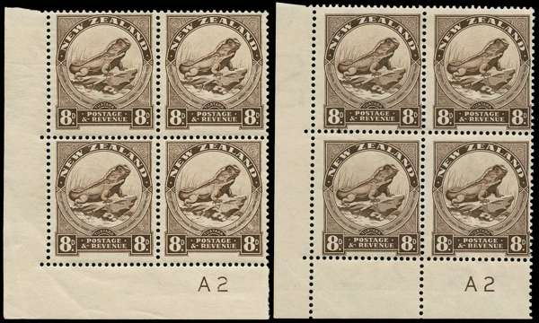 1935-36 8d chocolate 'Tuatara Lizard', wmk 43, perf 14x13½, two lower left corner blocks of 4 from plate 'A2', respectively with imperf and perf lower margins, fresh o.g. Minor marginal creases, and the first with a couple of small gum blemishes, still an attractive and scarce pair. CP L10a