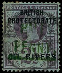 1893 ½d on 2½d handstamped Type 4 in green, used with Old Calabar River CDS; small defects. SG 11, £275