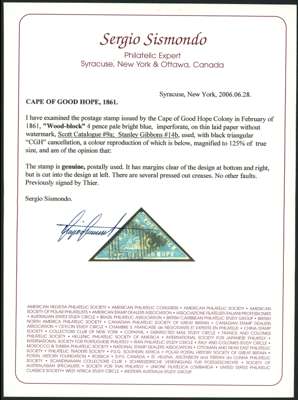 1861 'Woodblock' 4d pale bright blue with margins at right and base, just cut into at left, triangular cancel, pressed creases and a little oxidised. Signed Thier, Sismondo Certificate (2006). SG 15b, £3250