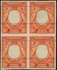 1938-54 20c plate proof of the frame in vermilion on unwatermarked security-lined paper block of four, creasing as usual. ...
