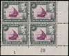 1938-47 50c purple and black, perf 13 x 11¾. Lower right corner block of four with Plate 1-2B, o.g., lightly hinged on top pair only, white gum. SG 144
