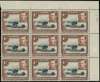 1942 1/- black and brown perf 13 x 11¾. Top right corner block of nine with various initials and other marks scratched on the selvedge right of R1/10. (These marks are believed to have been made on the extremities of the plates by inexperienced post-wartime staff, possibly testing a newly-sharpened burin or some such procedure, not necessarily realising that such scratches would show up on the sheet margins.) The initials include ‘CC’ twice, once crossed through. Interesting. SG 145a