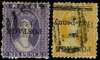 1976 6d violet, overprinted POSTAGE inverted, and ½d on 1d yellow with surcharge inverted, each use; fine save for some blunt perfs. SG 83b, 91a, £500