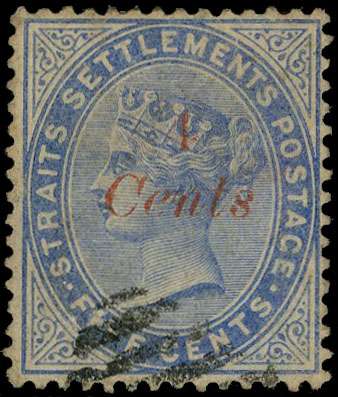 1884 4c in red on 5c blue, lightly used with barred cancel at base. SG 73, £160