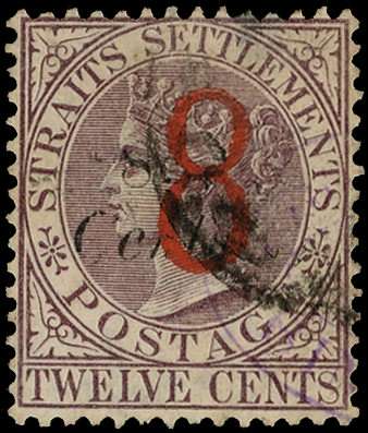 1884 8 on 8c on 12c brown-purple, used with small thin spot at top. SG 80, £500