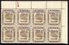 1942-4 5c chocolate corner block of eight, R1/8 ‘5c’ retouch, unmounted o.g. with some typical gum staining, good appearance. Part arricator on selvedge. SG J6, a, £205