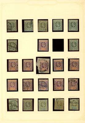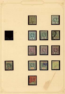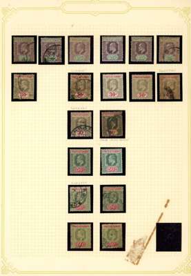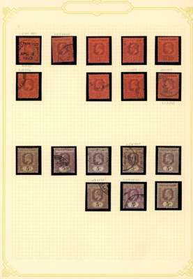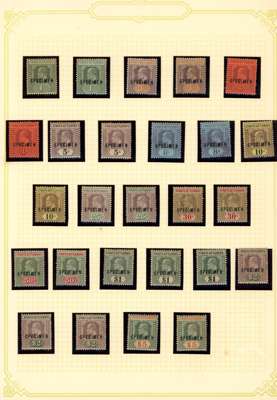 1902-3 set mint, used and Specimen collection (116) on leaves. Much is toned, but some is salvageable. Sets to $5 o.g., used, and Specimen (2 sets), with duplicates, also $10 fiscally cancelled with red seal (good appearance, brown on reverse). Needs viewing. SG 110-122