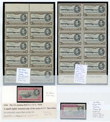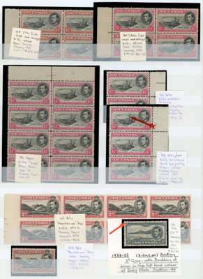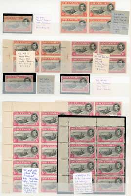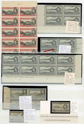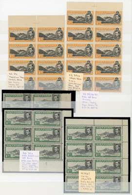 1938-53 varieties mostly in o.g. blocks, mainly unmounted, with some singles. Most have some degree of toning and viewing is recommended. Includes ½d both perfs blocks with long E, single with torpedo flaw, 1d perf 14 two blocks with Mountaineer, 1½d eight davit flaws and five cut mast and railings, also jibstay flaw, 2d scarlet Mountaineer flaw two blocks and single but oxidised, 1/- block and two singles with R6/4 re-entry and 2/6d perf 13 davit flaw single, toned