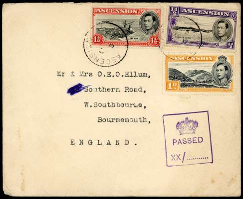 1940 cover to Kent with 3d black and ultramarine, AP 40 CDS, two-line ‘Passed/ by Censor’ (Mayo Type II) in black, a bit roughly opened; 1943 cover to Bournemouth with ½d, 1d and 1½d, 8 JA CDSs, violet Censor cachet (Mayo Type III), house number scribbled out otherwise good