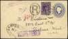 1916 3cts postal stationery envelope additionally franked by 1897 Royal Family 4ct ‘Queen Mary; violet, addressed to Washington State USA, tied by ’R' registered h/s with US straight lined Registered h/s at foot, with oval and 'SUPPOSED LIABLE CUSTOMS DUTY h/s at top left, backstamped by Boston Mass and Spokane Wash Reg markings, an interesting and attractive item. SG 88