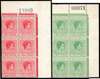 1941-51 2d scarlet and 1951 2d green and yellow-green in matched top right corner blocks of six with sheets numbers, each with R3/6 RP short ‘T’ (different states), unmounted o.g. SG 152ba, 152c var