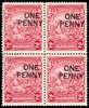 1947 1d on 2d perf 13½ x 13 o.g. block of four, very lightly hinged on the upper pair only. Lower right stamp with R6/2 short ‘Y’, and all four with surcharge misplaced upward to left. SG 264ec, £200