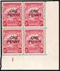 1947 1d on 2d perf 13½ x 13 Plate block of four, R11/9 extra frame line, unmounted o.g. SG 264ea, £200