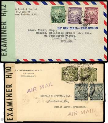 1939-45 covers (4). 1939 envelope (opened out) to Missouri, 2½d Tercentenary, with the rare OHMS Censor label PF275; 1943 Barbados to St Lucia first flight cover; 1943 censored cover to London franked at 3/1d, blue-green censor tape H/12; 1945 to Argentina franked at 2/8d, white censor tape H/10