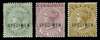 1883-1904 wmk CA ½d dull green, 2d aniline purple, 1s yellow-brown, opt "SPECIMEN" for UPU distribution, fresh large part o.g. to o.g. Slight imperfections (½d unobtrusive crease, 1s odd short perfs)