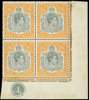 1939 (July) 12/6d pale grey and pale yellow-orange lower left corner Plate block of four showing the unique Plate plug, top pair large part o.g. with the lower pair unmounted. Fine appearance, just a little foxing on reverse. SG 120b, £440