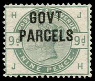 1883 9d Dull green (Govt. Parcels). Very fine and fresh unused o.g. example lettered JH, one slightly nibbed perf at upper right otherwise very presentable. Cat. £2750