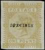 1878 £1 Colour trial. Very fine unused part o.g. imperforate example lettered CB. Printed in bistre on gummed watermarked paper overprinted "SPECIMEN" type 9. Scarce.
