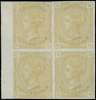 1876 4d Colour trial Pl.15. Very fine unused o.g. left wing margin imperforate block of four lettered NG-OH (Lower pair unmounted o.g.), printed in pale olive-bistre. Scarce. Ex "Verus".