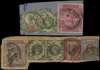 1883-84 High values used on piece, 2s6d on piece with two 1s, 10d and 9d tied with “LOMBARD STREET” cds (MR 1893). Also, 5s on piece 2d and 1s tied by “FENCHURCH ST.” registered oval (12 AP 1889), mixed condition, unusual (2 items)