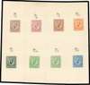 1910 ‘Hentschel’ 3d half tone essays, four pieces of proof paper (measuring approximately 40 x150mm each), each with two widely spaced examples in shades of brown (3), orange, green (3) and blue, all with a manuscript reference number above each design, numbered from W/17 to W/24. The four pieces hinged together to recreate the original larger piece. Fine and scarce, spectacular