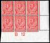 1911 1d Aniline scarlet (F). Superb unmounted o.g. bottom right hand corner marginal control ‘B12‘ block of six. Scarce with control.