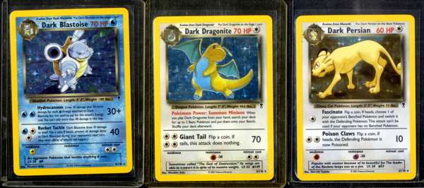 Complete near mint to mint Legendary collection that features the three exclusive promos from the theme decks, Non-holo Charizard, Blastoise and Dark Raichu - this is the most comprehensive Legendary collection list