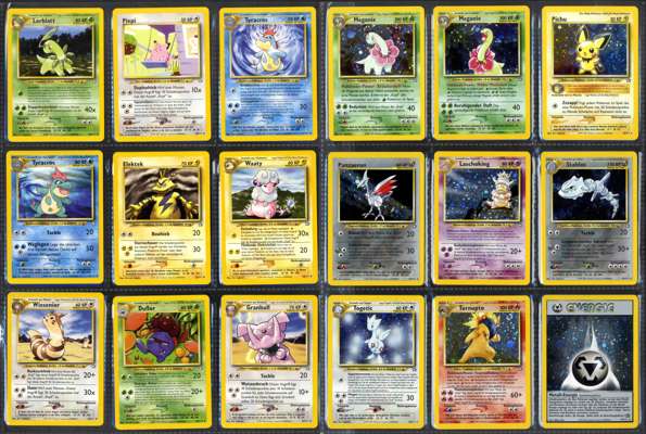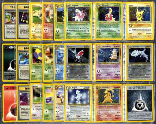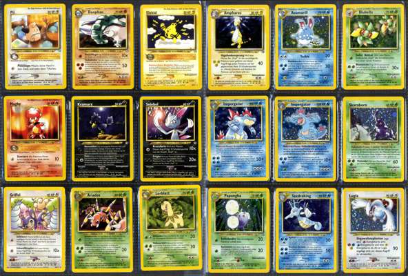 This near-complete German-language Neo Genesis set (Unlimited) is just one card short of a full set, missing only #18 Typhlosion. As the first set in the Gold & Silver/Generation II series, it features a variety of iconic Pokémon. German cards are exceptionally rare in this quantity, and this collection has been carefully stored for over 24 years. The cards range from near mint to mint, with the majority in mint condition, making this a prized acquisition for serious collectors.