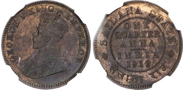 India, British Colonial. George V CU 1/4 Anna. Sailana mint, 1912. GEORGE V KING EMPEROR, crowned and draped bust to left, wearing chain of the Most Eminent Order of the Indian Empire / Denomination, INDIA and date in five lines within pelleted border; SAILANA STATE in English above, and Devnagari below. KM 16. 4.70g, 25.00mm, 11h.