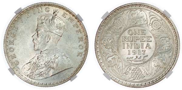 India, British Colonial. George V AG Rupee. 1917C. GEORGE V KING EMPORER over bust left / ONE RUPEE INDIA, date below in five lines with Urdu date, within ornate border. KM 524. 11.66g, 30.50mm, 12h.