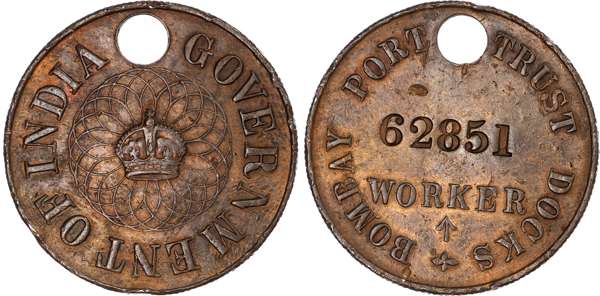 India. Bombay Port Trust Æ Workers Tally. 1890-1910. GOVERNMENT OF INDIA, crown centre on ornate design / PORT TRUST, DOCKS ✢ BOMBAY, WORKER 62851 ↑ holed as issued. 9.39g, 30.00mm, 12h.