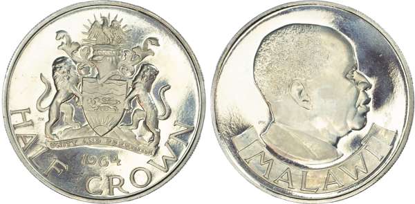 Malawi. Hastings Kamuzu Banda Ni Proof Halfcrown. .1964. MALAWI on banner below bust right / HALF CROWN, date above, UNITY AND FREEDOM on banner below Coat of Arms centre. KM 4. 14.70g, 32.40mm, 12h.