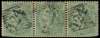 1856-64 India No wmk 4a green, horizontal strip of three, with individual fair to very fine "124" rhomboids of Aden. Faults (crease at top, end stamps with clipped perfs at foot), still good appearance. A rare multiple usage of this value. (cat £360+).