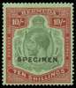 1924-32 10s green and red/pale emerald, Script wmk, variety "Broken crown and scroll" (R2/12), opt "SPECIMEN", large part o.g. One slightly shortish perf and tiny speck on gum, still fine fresh appearance. Maximum of seven possible !