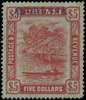 1944 $5 carmine/green, type 1 H/S in violet, large part o.g. Typical dried gum and minor traces of toning, still well above average with fresh colour. A very good example of this rare stamp. BPA cert (2020). (cat £1000)