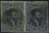 1852-57 10d dull blue 'Jacques Cartier', on thin handmade wove, horizontal pair with good to large margins, the right stamp with the prominent R3/5 Major Re-entry (strong line through 'CANADA', doubling of left '8d Stg.' and upper frame line), used with part target cancels. The left stamp with small thin at top, and vertical crease in margin between (not affecting either stamp), still above average. Rare and desirable in this se-tenant form. (cat £4950)