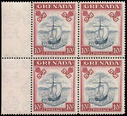 1947 10/- blue-black and bright carmine (wide frame) left marginal block of four, unmounted o.g., one stamp with a gum bend, otherwise fine.