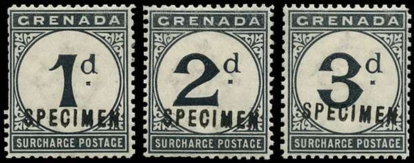 Postage Due. 1892 set of 3 to 3d, wmk CA, handstamped 'SPECIMEN' (type D11), brilliant large part o.g. Separated by scissors, with some trimmed perfs, but wonderfully fresh, and a set of exceptional interest and rarity, being LINE PERF, rather than comb perf as issued. Ex Samuel, and believed to be unique. (Not recorded in the 1976 book, but added to the 1984 supplement).