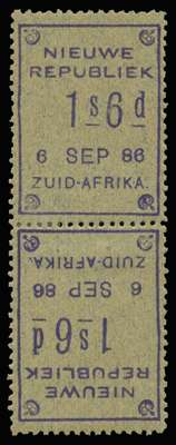 1886-87 "1s6d" violet on blue granite paper, without embossed arms, dated "6 SEP 86", tete-beche vertical pair, large part o.g. Trivial traces of gum toning, still very fine for this. ONly ten pairs recorded by Jonkers (p.119). (cat £650)