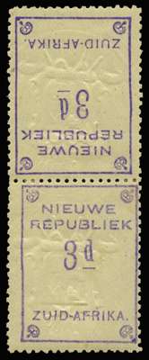 1887 3d violet on yellow, undated issue with embossed arms, TETE-BECHE vertical pair with arms inverted on one stamp, large part o.g. Odd slightly shortish perfs and few tiny tone specks, still fine for this issue. Only seven such pairs recorded by Jonkers (p.119). (cat £350)
