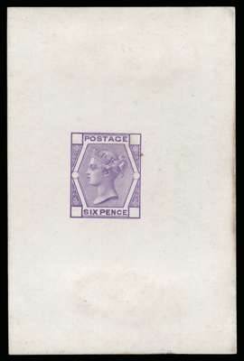 1873 6d Die proof. Very fine example printed in bright violet on white glazed card (61 x 92mm), endorsed "AB Violet" on reverse. Very rare only two or three examples of each colour are recorded.