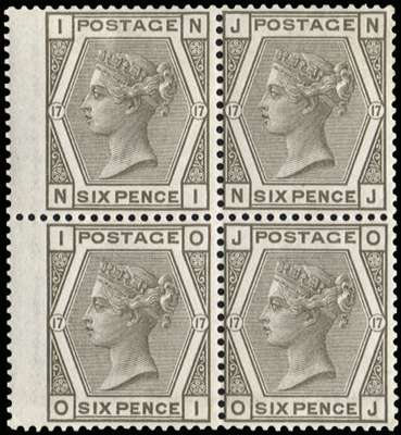 1880 6d Grey Pl.17. Exceptionally fine and fresh unused o.g. left hand wing margin block of four lettered NI-OJ. An extremely attractive and rare multiple.