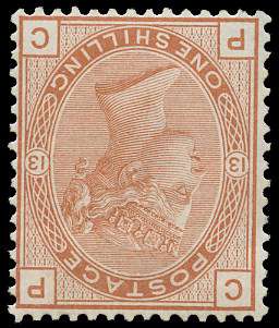 1880 1s Orange-brown Pl.13 (Wmk. Spray Inverted). Superb unused o.g. example lettered PC. A wonderful example of this very rare watermark variety and the first unused example we have handled in over twenty years. SG151wi, Cat £11,000