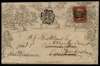 1840 1d Mulready envelope Forme 3 Stereo A157. Very fine used example sent from Monmouth to Evesham, redirected to Tewkesbury, neatly cancelled by a black MC., Uprated with an additional 1d red brown Pl.30 lettered NE, cancelled by a black MC and endorsed "paid 1d". Backstamped by a Monmouth dispatch cds for NO.16.1843 , two deep blue Evesham datestamps for arrival and redirection on NO.17.1843 and a Tewksesbury arrival datestamp for the following day. A scarce uprated franking. 2014 BPA Cert. Spec. ME2b.
