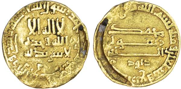Abbasid, temp. Al‑Rashid (AH 170‑193 / 786‑809 AD), gold Dinar, AH 174 / 790/1 AD, citing Da’ud, 4.10g (A. 218.9). Fair, ex ring mount, damaged.