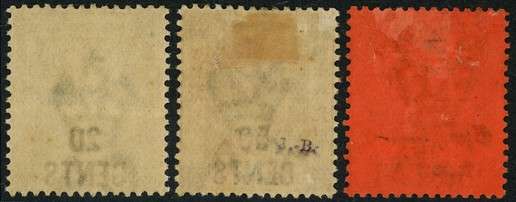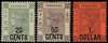 1891 DLR surcharge trio, mint. 20c on 30c grey-green unmounted, minor wrinkle; 50c on 48c dull purple, o.g. with hinge remainder; $1 on 96c purple on red paper, part o.g. (thinnish in places) and thinned at top. All with good appearance. SG 45-7, £1305