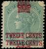 1867 12c on India 4a green mint example with surcharge double. Small part o.g. with a crude hinge repair to a cut at lower...