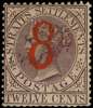 1884 8 on 8c on 12c brown-purple, the type 23 surcharge in blue, unused without gum; perfs at base a little blunt, otherwise fine and a rare stamp. RPS Certificate (1939). SG 80b, £11000