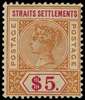 1898 $5 orange and carmine large part (slightly brown) o.g., showing a large circular mark on the neck, presumably random but quite unusual. SG 105, £475